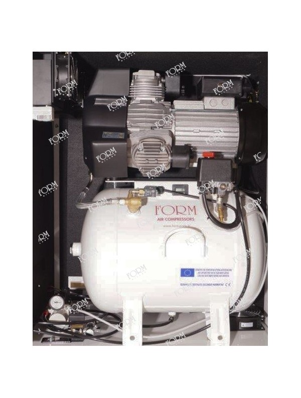 Compressore silenziato (A) 14 bar/6 lt, carico aria 50 l/min, doppio manometro, filtro anti condensa in acciaio inox con variatore di pressione e drenaggio condensa manuale ed automatico regolabile elettronicamente; serbatoio di recupero condensa da 1 lt, , corredato di tutte le certificazioni di legge (serbatoio, valvola di sicurezza e...