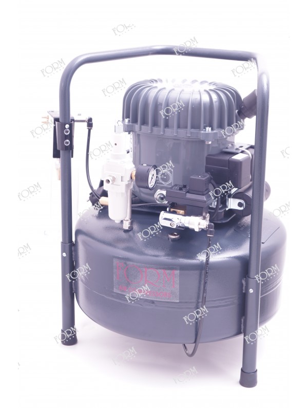 Compressore con funzionamento a secco e sistema essiccatore; capacità 24 litri, doppia uscita d'aria per l'alta pressione e pressione di servizio
