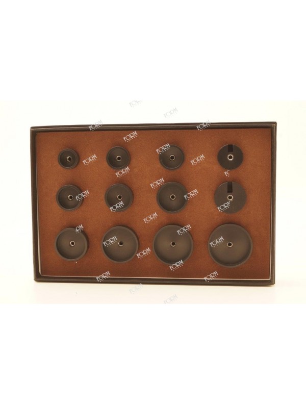Set di 13 tasselli reversibili in duraluminium anodizzato nero con bordo inclinato per la piazzatura dei vetri bag, attacco a vite per potenza Bergeon 5500 a-c- 6173 - Horotec - Greiner - AF - Wit- da diametro 15 a 48 m/m
