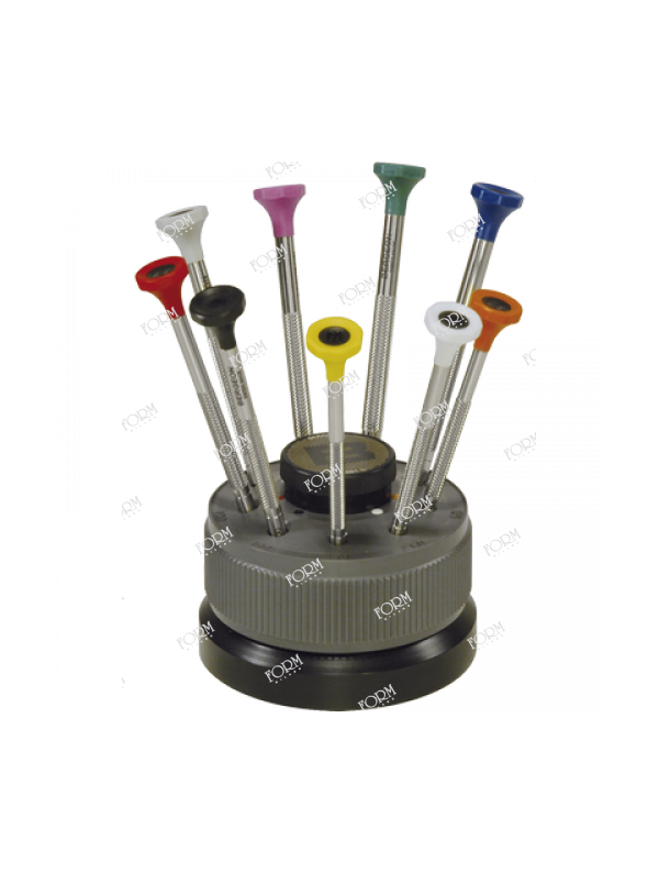 Set di cacciaviti in lega di alluminio 10 pezzi, base girevole con cuscinetto a sfere, diametro da 90 mm, lame antimagnetiche in acciaio temperato 53/55 HRC diametri presenti; 0,50 - 0,60 - 0,80 -1,00 - 1,20 - 1,40 - 1,60 - 2,00 - 2,50 - 3,00 - corpo ricoperto da una membrana in elastomero che garantisce una maggiore ergonomicità, testa...