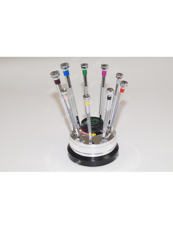 Set di cacciaviti in lega di alluminio 10 pezzi, base girevole con cuscinetto a sfere, diametro da 90 mm, lame antimagnetiche in acciaio temperato 53/55 HRC diametri presenti; 0,50 - 0,60 - 0,80 -1,00 - 1,20 - 1,40 - 1,60 - 2,00 - 2,50 - 3,00 - corpo ricoperto da una membrana in elastomero che garantisce una maggiore ergonomicità, testa...