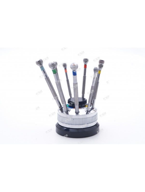 Set di cacciaviti in lega di alluminio 10 pezzi, base girevole con cuscinetto a sfere, diametro da 90 mm, lame antimagnetiche in acciaio temperato 53/55 HRC diametri presenti; 0,50 - 0,60 - 0,80 -1,00 - 1,20 - 1,40 - 1,60 - 2,00 - 2,50 - 3,00 - corpo ricoperto da una membrana in elastomero che garantisce una maggiore ergonomicità, testa...