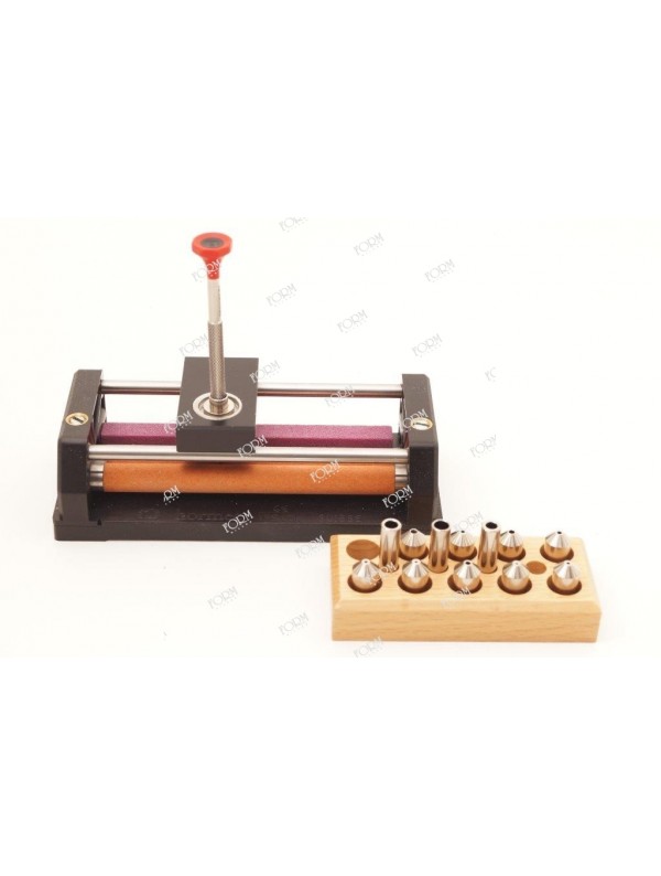 Utensile Bergeon per affilare le punte cacciaviti , grazie alle due mole cilindriche le lame vengono affilate in modo parallelo con una leggera raggiatura e non a cuneo, la mola piana rende l'estremità perfettamente piana.