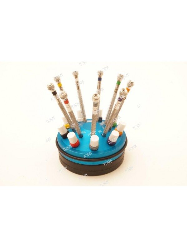 Set di cacciaviti in lega di alluminio 10 pezzi, base girevole con cuscinetto a sfere, diametro da 90 mm, lame antimagnetiche in acciaio temperato 53/55 HRC diametri presenti; 0,50 - 0,60 - 0,80 -1,00 - 1,20 - 1,40 - 1,60 - 2,00 - 2,50 - 3,00 - corpo ricoperto da una membrana in elastomero che garantisce una maggiore ergonomicità, testa...