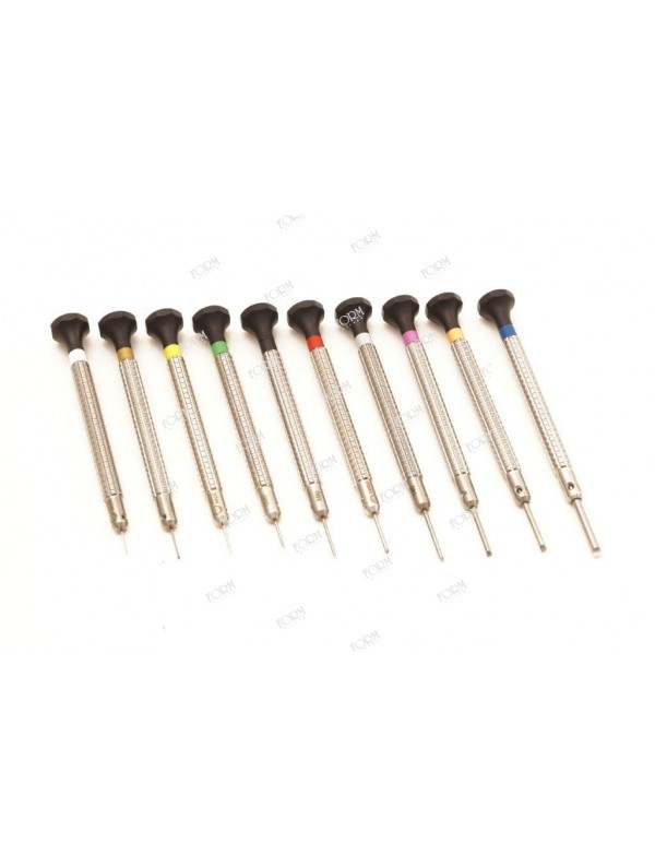 Assortimento di 10 cacciaviti Bergeon completamente in acciaio testa in POM lame di ricambio per ogni diametro. da 0,50 a 3,00 mm