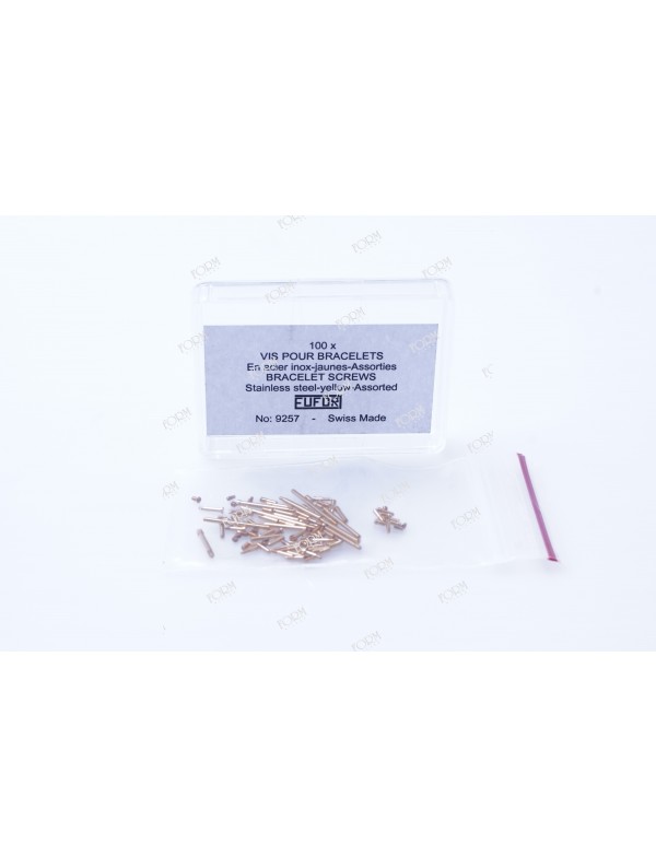 Assortimento di 100 viti in acciaio inox dorate per bracciali di vari diametri e lunghezze. swiss made