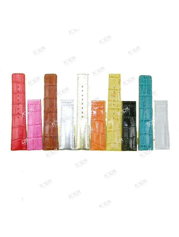Vera lucertola semi imbottito con cucitura su tono e attacco aperto per orologi ad ansa fissa; colori: nero, gold e bordeaux. Misure disponibili: da 10 a 20 m/m. Manifattura italiana