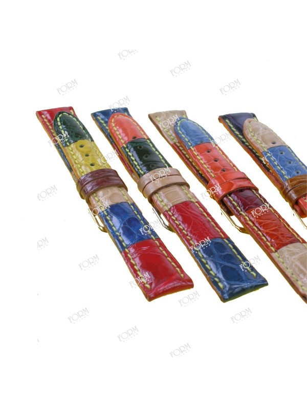 Divertenti colori lucido/opaco in vero coccodrillo con bordi semi ribordati e cucitura gialla. Manifattura artigianale italiana. Disponibili nelle misure 16 e 18 m/m