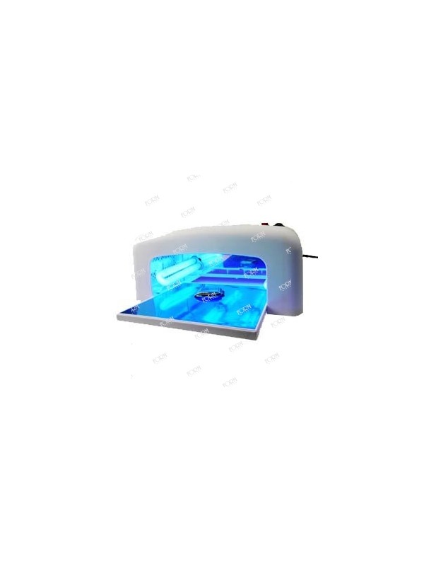 Lampada ad ultravioletti per incollare i vetri; 4 neon da 9w, timer 120 sec e piano d'appoggio estraibile. Dimensioni: 100x220x240, peso 1.7 Kg
