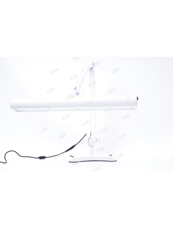Lampada da banco con LED da 21 Watt, colore luce bianco variabile tramite pulsanti touch fino a 7.000 g Kelvin, struttura metallica con 3 snodi, fissaggio a morsetto. Altezza 450 mm, misure dell'alloggiamento del riflettore in materiale sintetico 575 x 85 mm