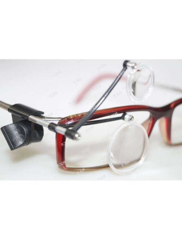 Struttura in materiale plastico molto resistente con fissaggio sulla stanghetta degli occhiali. Utilizzabile come semplice lente per occhiali oppure con duplicatore doppio 14X come lente da controllo. Compresi nella confezione tre adattatori per più stanghette, e cacciavite per il fissaggio