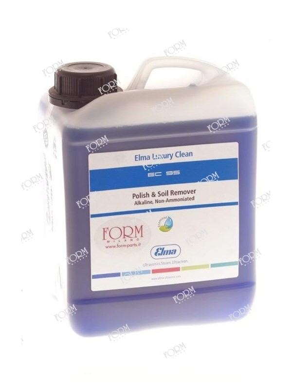 Elma EC 95 concentrato alcalino per rimuovere paste di pulitura e contaminazioni generali dei metalli, particolarmente indicato per l'acciaio, utilizzandolo con bagni ad immersione (diluito al 5%) o ad ultrasuoni (diluito al 2%)