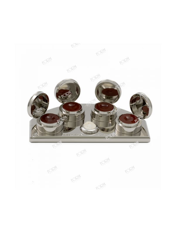 Porta olio a 4 scomparti indipendenti con vaschette in rubino più vano porta sambuco per pulizia punte. Struttura in acciaio a specchio