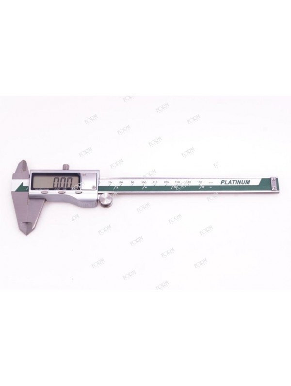 Calibro digitale centesimale da 0-150 mm, completamente in acciaio inox e ampio display, misure in mm e Inch, 3 pulsanti di accensione/spegnimento, rimessa a zero e cambio unità di misura. fornito con batteria di ricambio da 1,5 V e custodia in materiale sintetico.