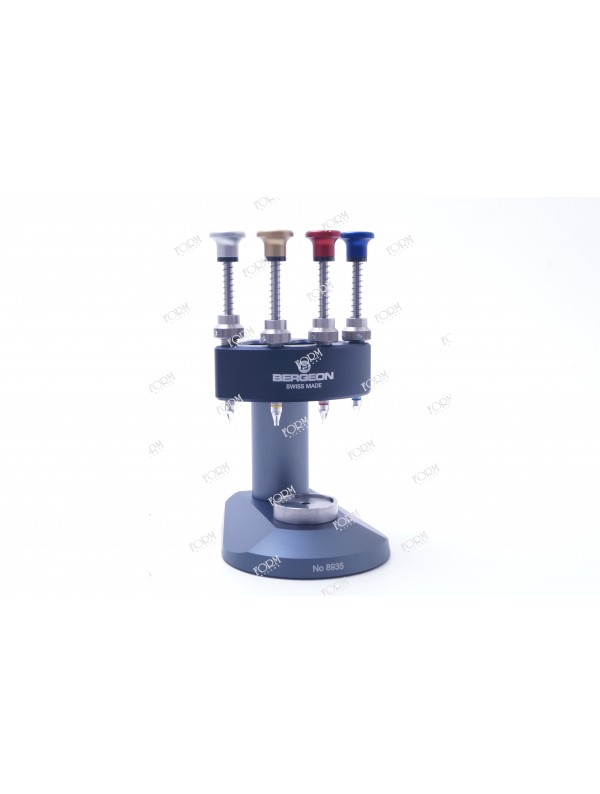 Potenza posa sfere in alluminio anodizzato Bergeon con regolazione fine corsa micrometrica, un punzone porta tasselli e set di 5 tasselli anti segno in materiale acrilico - base porta movimento da 31 mm.