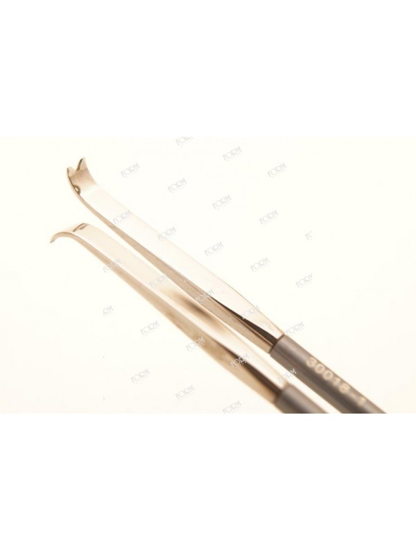 lunghezza tot. 105 mm, finitura in acciaio lucido, angolo di curvatura lame a 70°, spessore lama 0,15 mm, larghezza lama 2,5 mm, manici antiscivolo godronati in alluminio anodizzato.