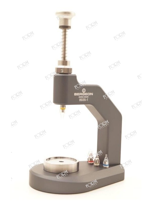 Potenza posa sfere in alluminio anodizzato Bergeon con regolazione fine corsa micrometrica, un punzone porta tasselli e set di 5 tasselli anti segno in materiale acrilico - base porta movimento da 31 mm.