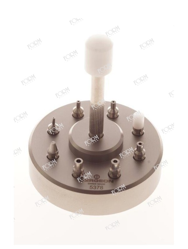 Posa sfere manuale Bergeon 5378 con 6 tasselli forati diametro 0,30-0,50-0,70-1,15-1,50-1,70 - tassello piano in teflon, tassello piano in acciaio. Broche porta tasselli e base in metallo nichelato e sabbiato da 50 mm