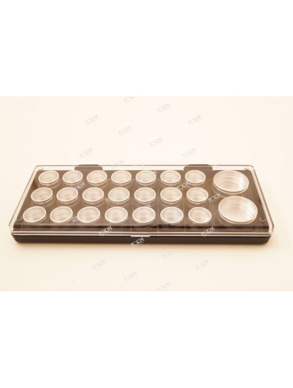 Scatola plex completa di 20 scatolini con coperchio trasparente, diametro 30 x ht 20 m/m, dimensioni 170 x 135 x 20 m/m
