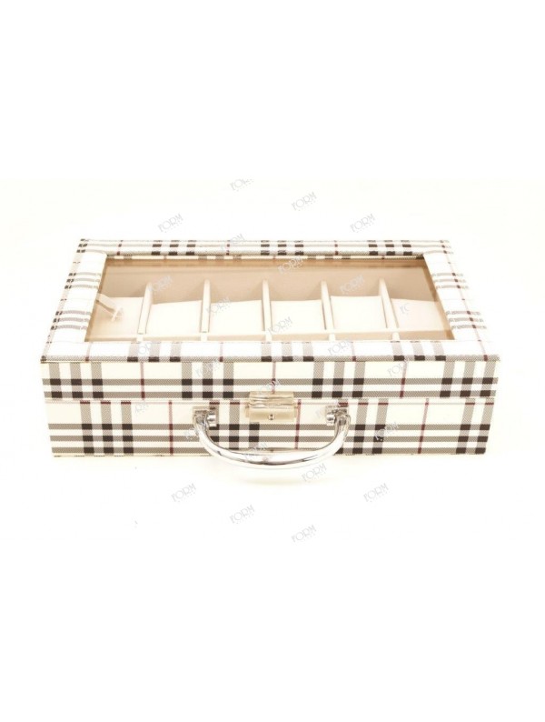 Scatola in legno e tessuto, coperchio a vista, maniglia in metallo cromato e chiusura con chiave, fodera interna e cuscini porta orologi in similpelle estraibili beige, 10 box. ingombri; 314 x 230 x 84 m/m