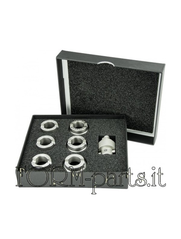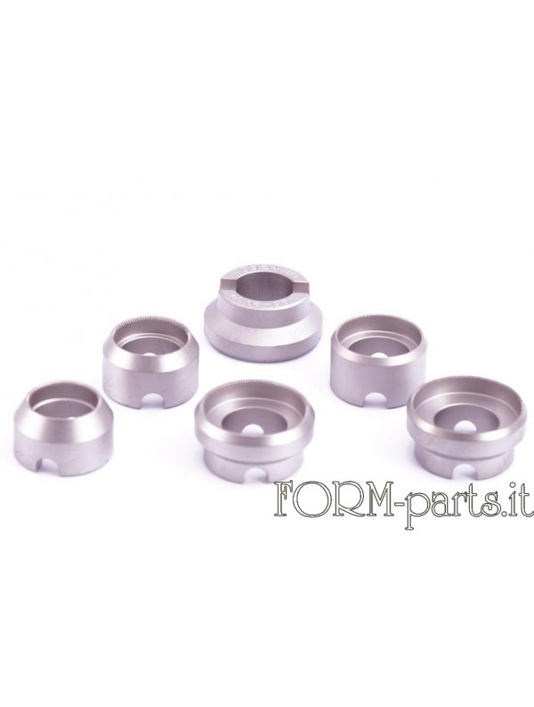 Set di 8 tasselli e 2 attacchi in alluminio con protezione in teflon per il fissaggio delle ghiere/lunette, attacco a vite classico per tutte le potenze Svizzere, diametri presenti da 28 a 55 mm.